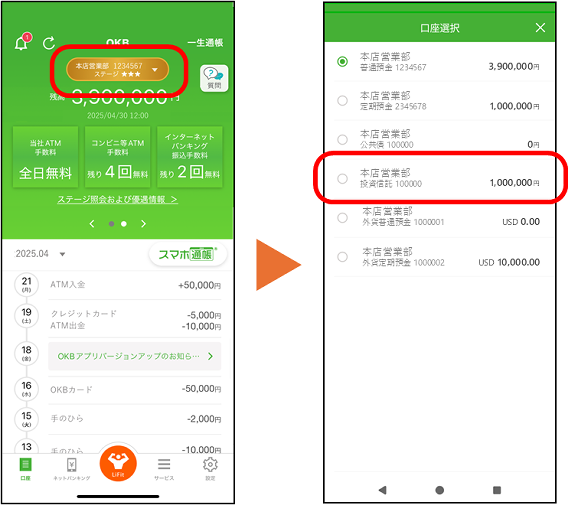なお、評価額や残高を確認することができるOKBの証券口座は、OKBアプリ(OKBアカウント)に登録済みの普通預金(総合口座を含みます)と、同じ店番・同じCIF(お客さま番号)である必要があります。